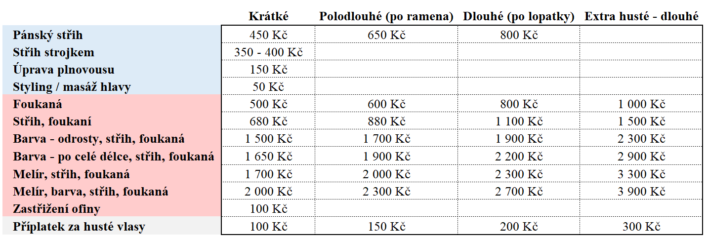 Cena se může lišit podle náročnosti úkonů, délky vlasů a množství spotřebovaného materiálu.